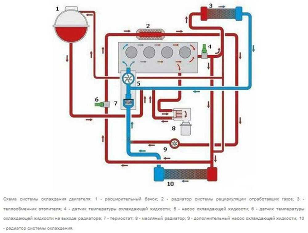 Для поддержания теплового баланса двигателя и эффективного отвода лишнего тепла в атмосферу предусмотрена система охлаждения. В задачи системы входит не только защита агрегата от перегрева. Чрезмерный отвод тепла также отрицательно сказывается на работе мотора: увеличивается вязкость масла, повышается коэффициент трения, влияющий на величину износа трущихся поверхностей.