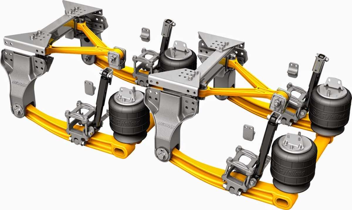 Как правило, для большинства автомобилей применение четырех верхних рычагов предпочтительнее реализации независимой подвески. Конструктивно установка любой подвески на шасси является типичной, будь то пневматический баллон, система ShockWave (баллон со встроенным амортизатором) или обычная металлическая пружина. Пневматическая подвеска легко регулируется в широком диапазоне значений в зависимости от веса транспортного средства – необходимо просто нагнать давление с помощью компрессора или стравить его.