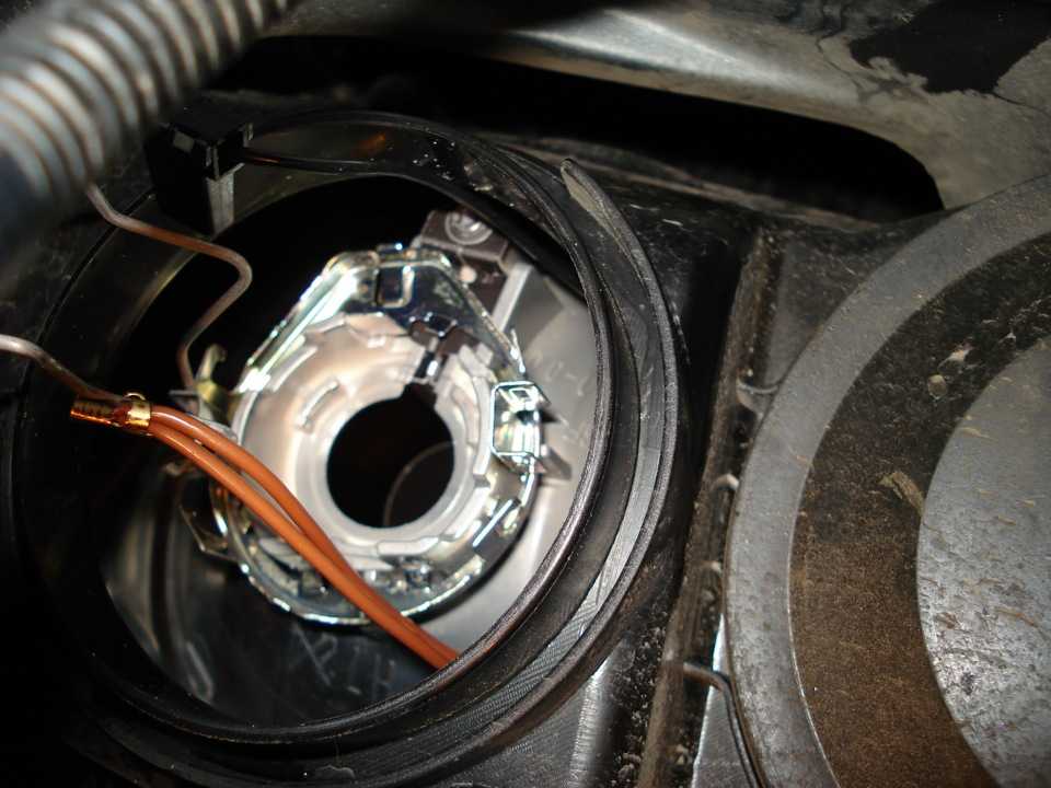 Новую ксеноновую лампу аккуратно извлекаем из защитной колбы и вставляем в отверстие. Помните о том, что касаться колбы руками нельзя. Если у вас была пружинка, которая фиксировала галогенную лампу, то ее необходимо примять. Дело в том, что провода от ксеноновых ламп необходимо будет протянуть сквозь нее и затем вывести через заглушку в подкапотное пространство.