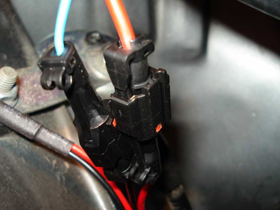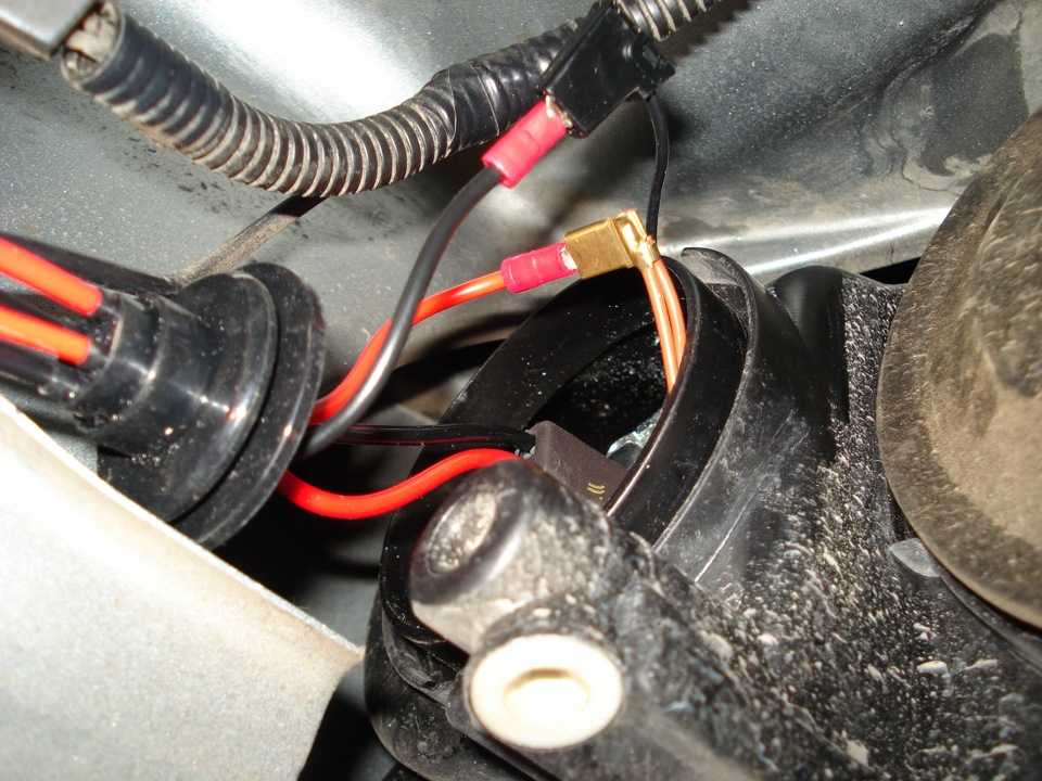 Со стороны аккумулятора сделать это будет немного сложнее, так как он будет частично загораживать доступ к фаре. Поэтому его лучше снять. После установки лампочек подсоединяем к ним клеммы от блока розжига.