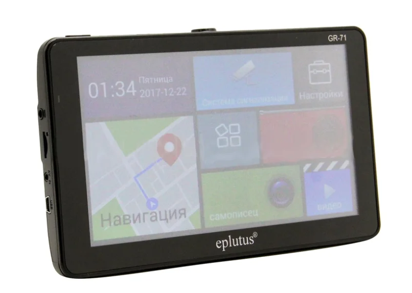 Вторую категорию мы решили начать лучшим навигатором с видеорегистратором – GR-71 производства Eplutus. Эта модель может похвастать 7-дюймовым экраном разрешением 800 на 480 точек, процессором с частотой 1,3 ГГц и 512 МБ оперативной памяти. Работает девайс на базе операционной системы Android 4.4, поэтому при желании сюда получится установить любые карты, которые требуются пользователю. Конечно же, за счёт выбранной системы здесь доступно большое количество функций, включая проигрывание видео и просмотр фото. Есть в устройстве и FM-трансмиттер.