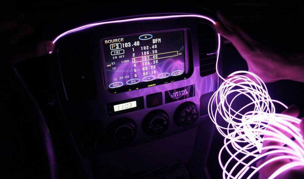 Неон на авто все чаще используется для стилизации салона. Речь пойдет о холодном неоне, который представляет собой ПВХ шнур, являющийся цветной оболочкой, со светящимся внутренним слоем (люминофором) и жилами питания. Главное преимущество холодного неона перед обычными неоновими трубками – эластичность. Светящийся шнур может принимать любую форму, что и позволило использовать его для тюнинга интерьера автомобиля. Холодный неон достаточно долговечен, а установить его можно своими руками. Существуют несколько серий гибкого неона: