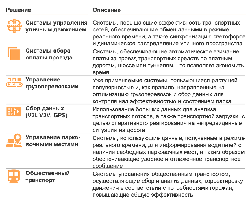 Самым активно развивающимся сегментом ИТ в сфере транспорта на сегодняшний день является внедрение интеллектуальных транспортных систем. Это системы управления уличным движением, общественным транспортом и грузоперевозками, парковочными местами, сбора оплаты проезда. Аналитики PwC считают, что именно он будет наиболее динамично развиваться и дальше.