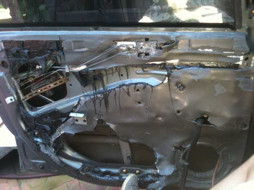 Внутренние полости дверей хорошенько протрите уайт-спиритом, пока не удалите грязь и остатки консерванта. Если наткнетесь на островки заводской виброизоляции, то оставьте их на месте: ваша задача – усовершенствовать конструкцию, а не поменять виброгаситель.
