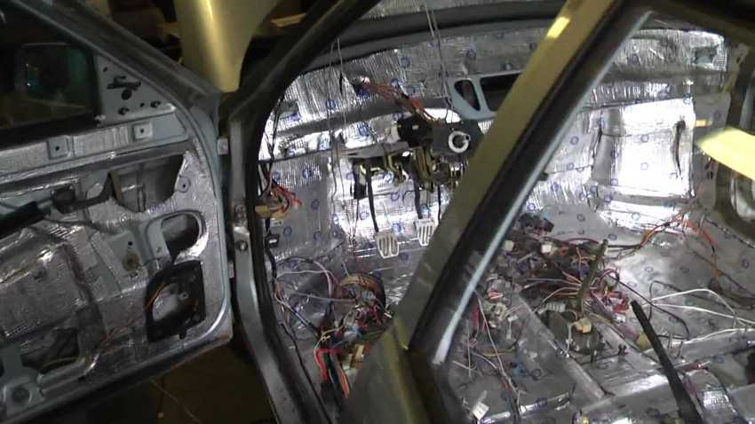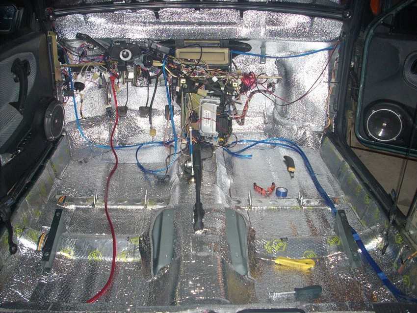 Сложность разборки зависит от марки и модификации авто. Возможно, придется демонтировать механизмы стеклоподъемников в дверях и вытащить окна вместе с уплотнителями. Провода, упрятанные под старым ковролином, аккуратно скрутите в жгуты и обмотайте полиэтиленом.