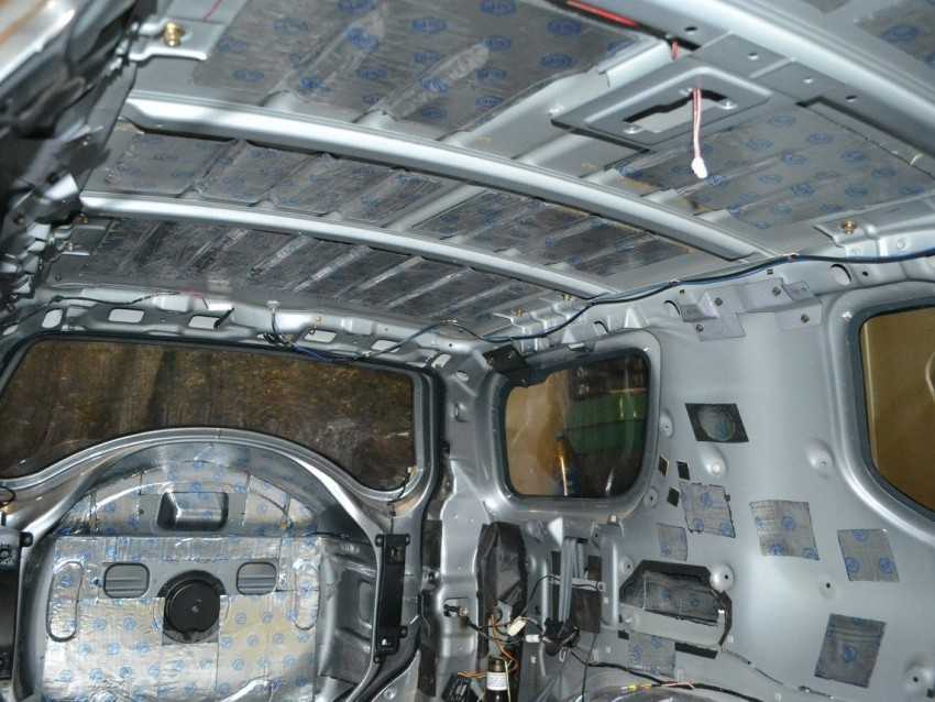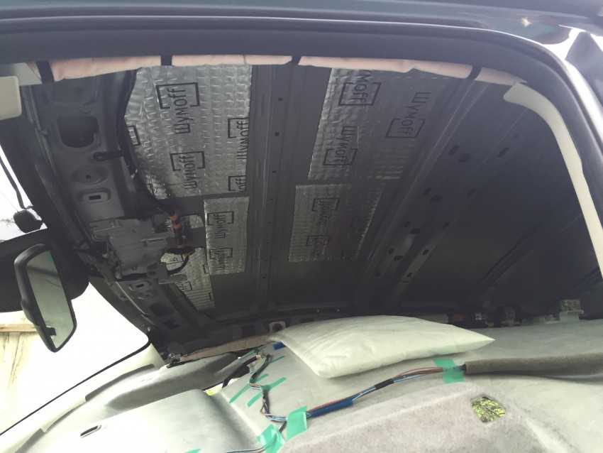 - Снимаете обшивку с крыши салона, удаляете заводскую, если она есть, шумоизоляцию (обычно бывает тонкий слой пленки на клею, от которого все равно пользы никакой)
